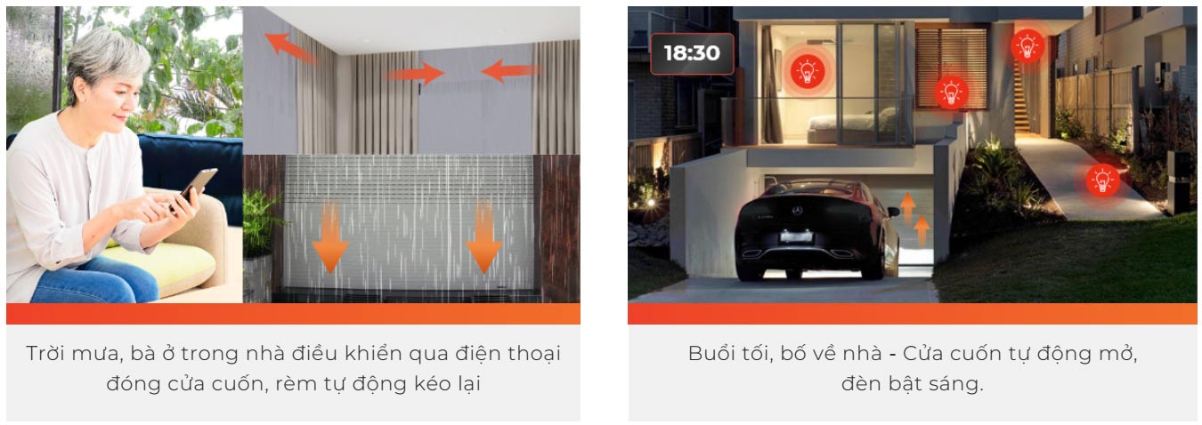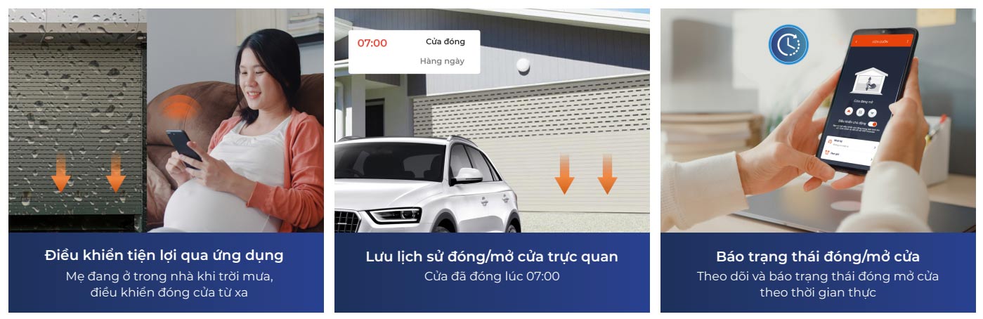 Với công tắc điều khiển cửa cuốn thông minh, bạn có thể điều khiển đóng mở cửa cuốn từ xa bằng smartphone. Bố mẹ lên chơi có thể mở cửa vào nhà ngay mà bạn không cần phải cất công đi từ cơ quan về mở. Trời mưa gió bạn có thể ngồi trên xe mở cửa lái vào nhà mà không cần phải xuống xe. Bạn cũng không còn phải lo lắng khi đi ra ngoài quên khóa cửa hoặc quên mang theo chìa khóa. Thật là tiện lợi vô cùng!